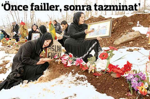 Uludere’de F-16 bom-bardımanında yaşamını yitirenlerin aileleri ortak karar aldı: “Acımız daha önemli. Önce olayın failleri bulunsun. Bu tazminatı almayız.” Şırnak’ın Uludere ilçesinde F-16’lardan atılan bombalarla yaşamını yitiren 34 köylünün aileleri, aldıkları ortak bir kararla saldırının failleri bulunana kadar kendilerine ödenecek tazminatı almayacaklarını açıkladı. Aileler adına Radikal’e konuşan Ubeydullah Encü ve Zeki Tosun, “Önce çocuklarımızın failleri bulunsun. Sonra tazminat meselesini bizimle görüşsünler” dedi.